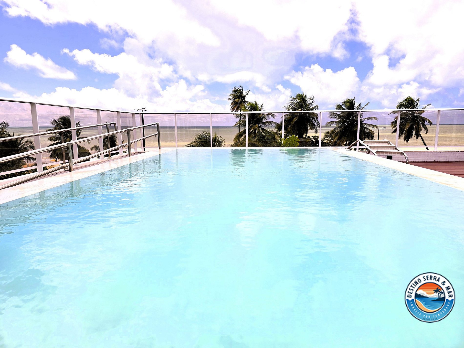 Terraço com piscina na cobertura, espreguiçadeiras e vista da orla